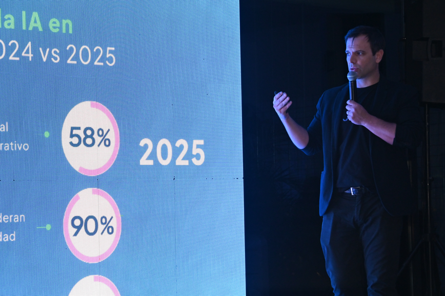 Después de la bienvenida de nuestro CEO Matías Michelis, quien presentó a los exponentes y dio contexto sobre el propósito del encuentro, comenzó la presentación central a cargo de José Horta, nuestro Chief Innovation Officer. Con una visión clara, José destacó que para nosotros la inteligencia artificial no es una tendencia, sino un conjunto de tecnologías que venimos aplicando de forma estratégica desde hace años. Contó cómo empezamos integrando IA con funciones como la transcripción automática, el reconocimiento de documentos a través de OCR y la biometría, y cómo esa evolución nos llevó al presente, una IA generativa que hoy está en el centro de nuestras soluciones conversacionales.